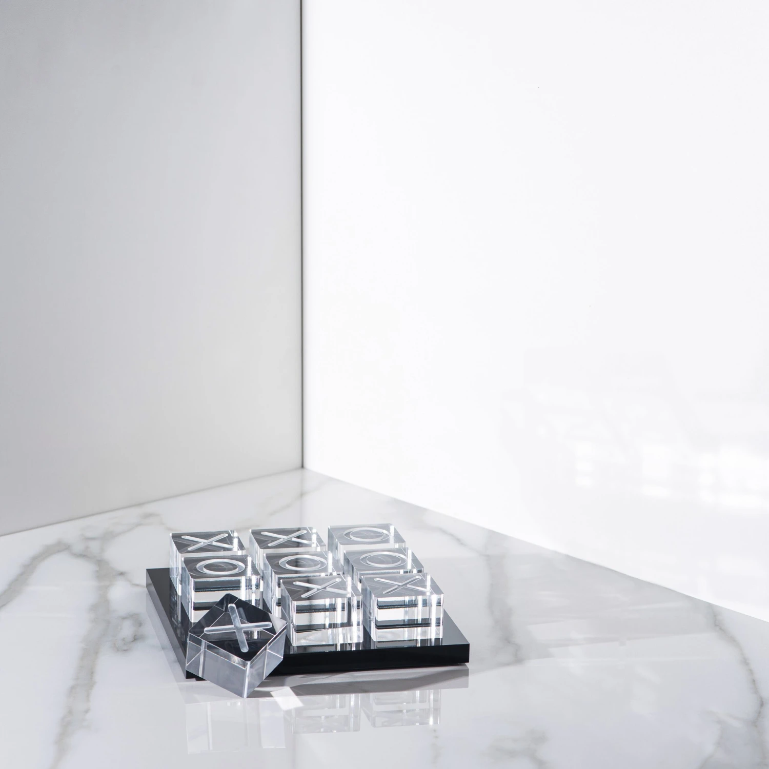 This Lucite tic tac toe set makes a modern, playful addition to your game room. Clear blocks on a black tray create chic contrast decor.