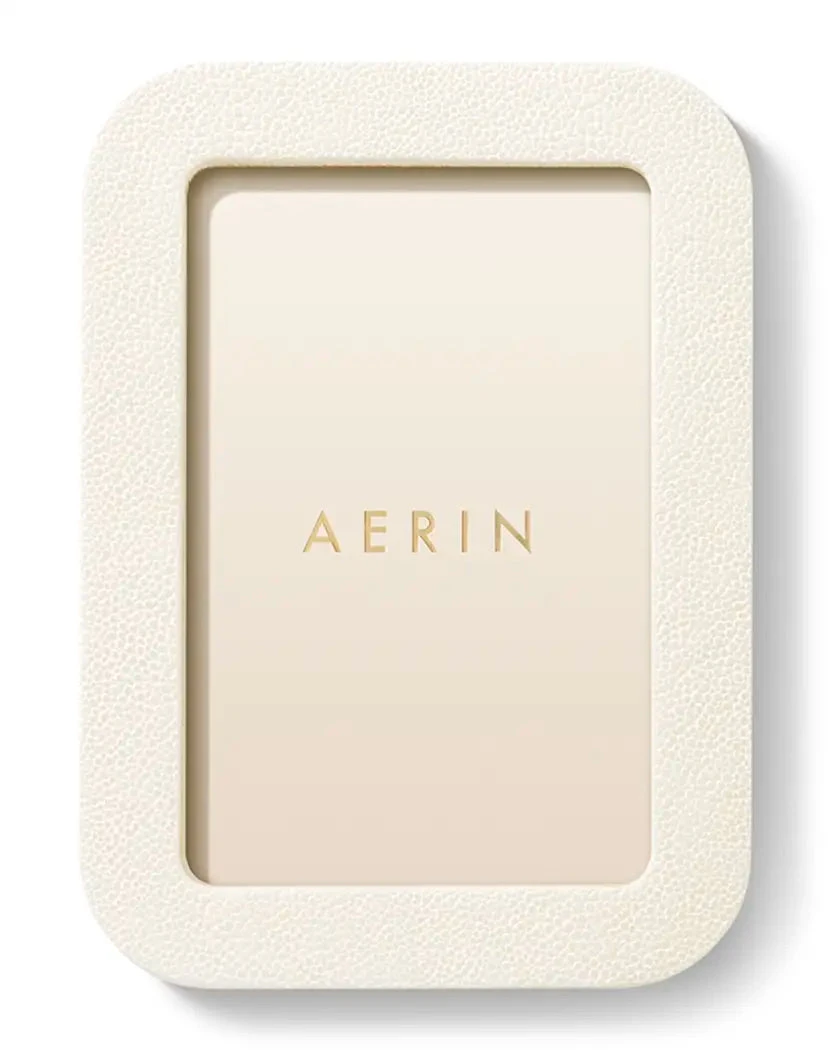 This contemporary frame is finished with textured, embossed shagreen and is styled with curved lines. The minimalist design, without any additional enhancement, provides a fresh, clean look.
