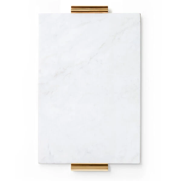 Minimal and sophisticated, this beautiful cheese board in sleek white marble, accentuated with tubular brass handles, is a stylish addition to a tabletop. A classic piece, it is hugely versatile, working perfectly for everyday use as well as for entertaining.