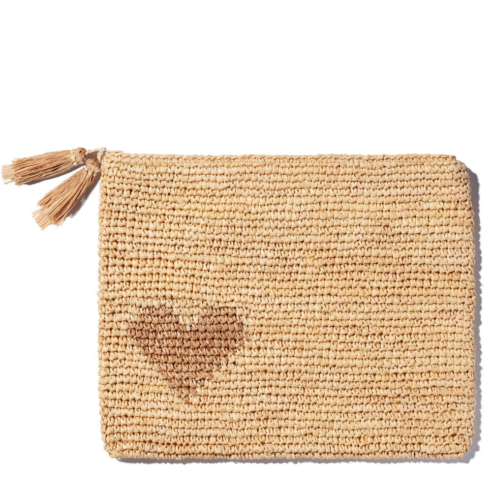A fun accessory with a natural touch, this AERIN Raffia Bag has a double tassel and heart detail. The perfect daytime pouch for your keys, phone, and lip-gloss.