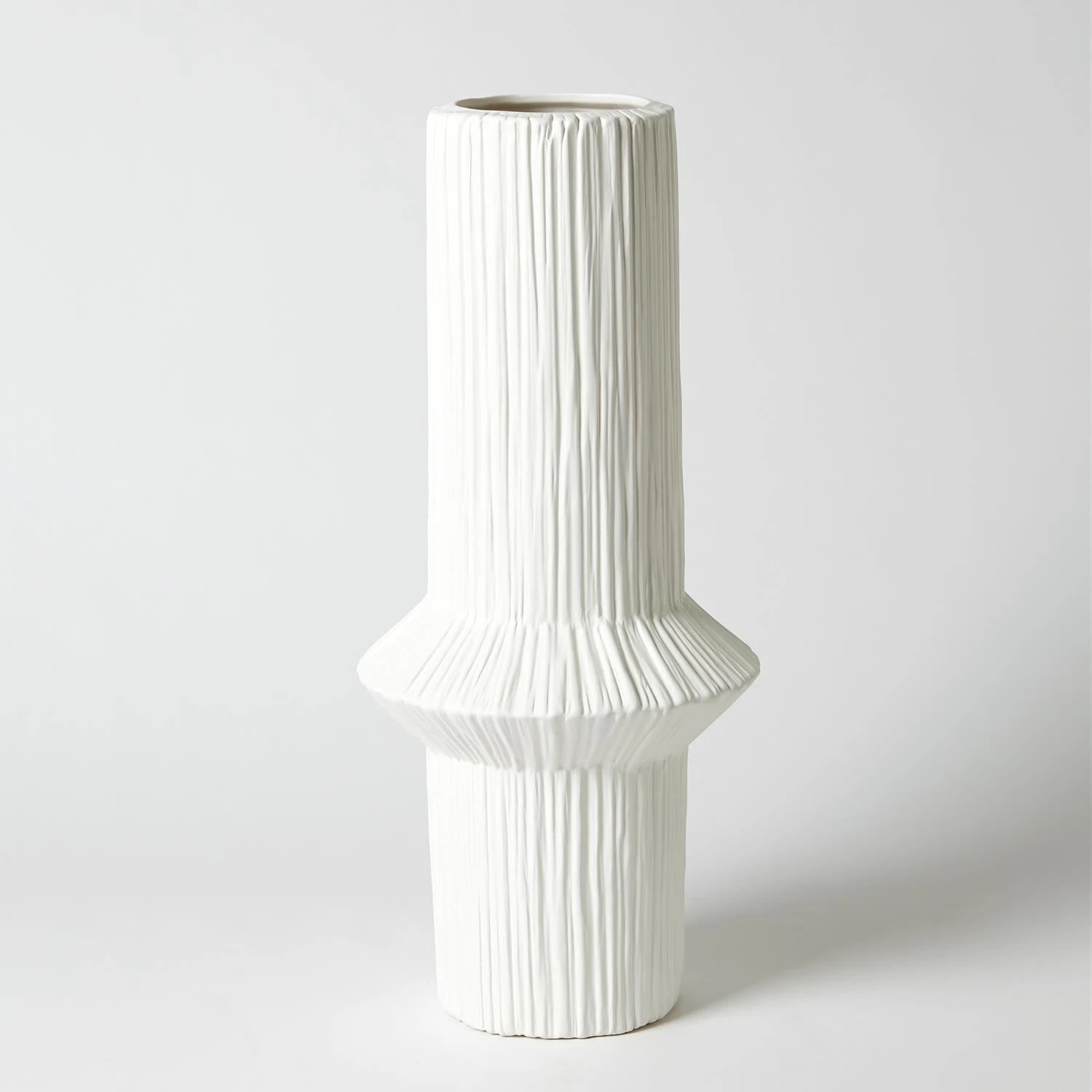 These ascending ring vases each have a pointed collar that coordinates with its respective size. Heavily textured and finished in a matte white glaze.