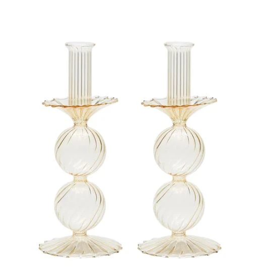 The delicate, hand-blown glass Bella Candlestick features two stacked globes atop a scalloped base. This stunning glass candlestick adds movement and sophistication to any table.