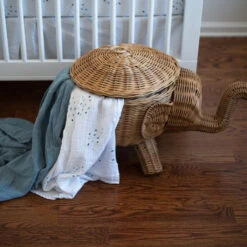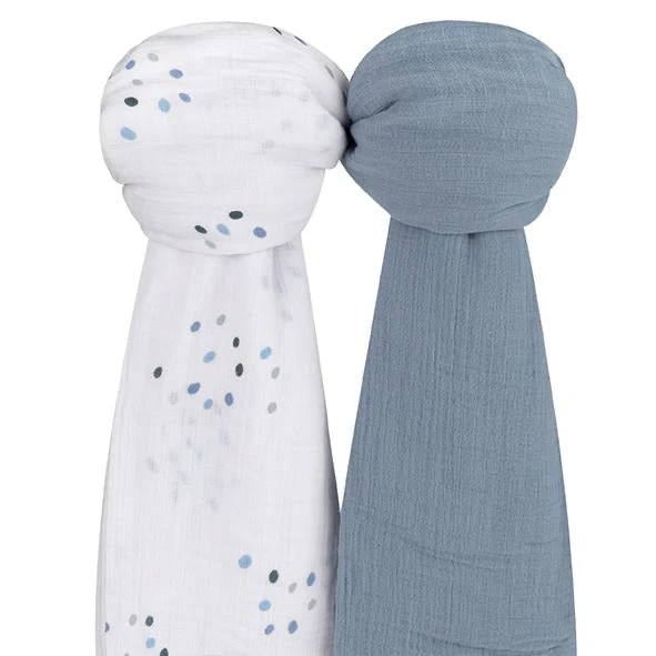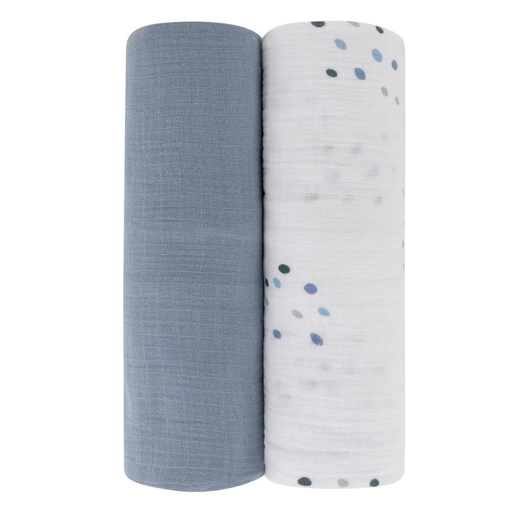 This duo features two modern swaddles. A solid ocean blue and a complimenting raindrop design in beautiful hues of blue.