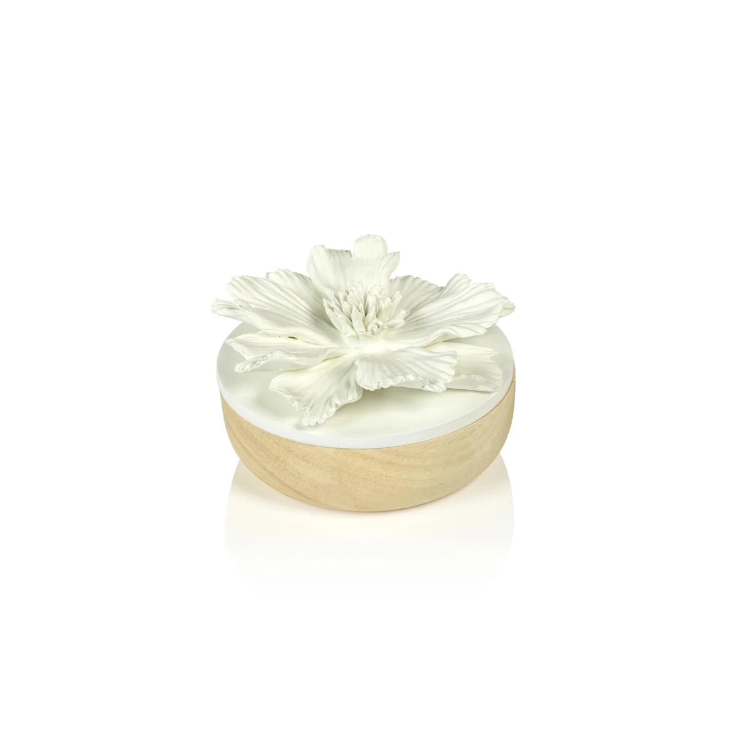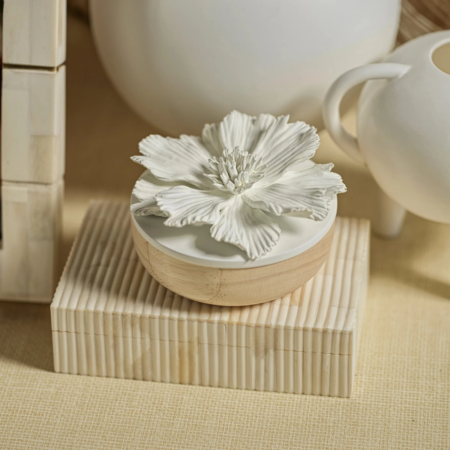 A porcelain cosmos flower adorns the top of this lovely natural wood storage box – a beautiful piece to style a coffee or bedside table or to give as a gift.