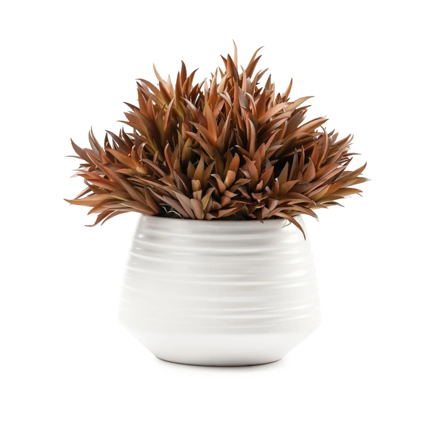 This succulent is a striking addition to any home, with its white ribbed vase and auburn succulent creating a modern yet timeless design.Â