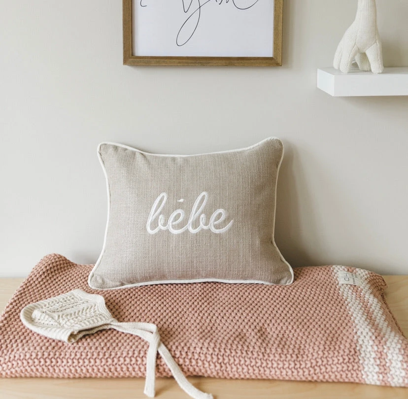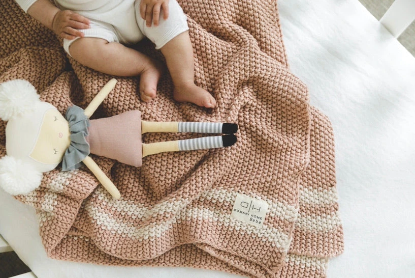 Our DH marici knit blanket is a favorite for its softness and warmth, with two stripes across the bottom its a classic.