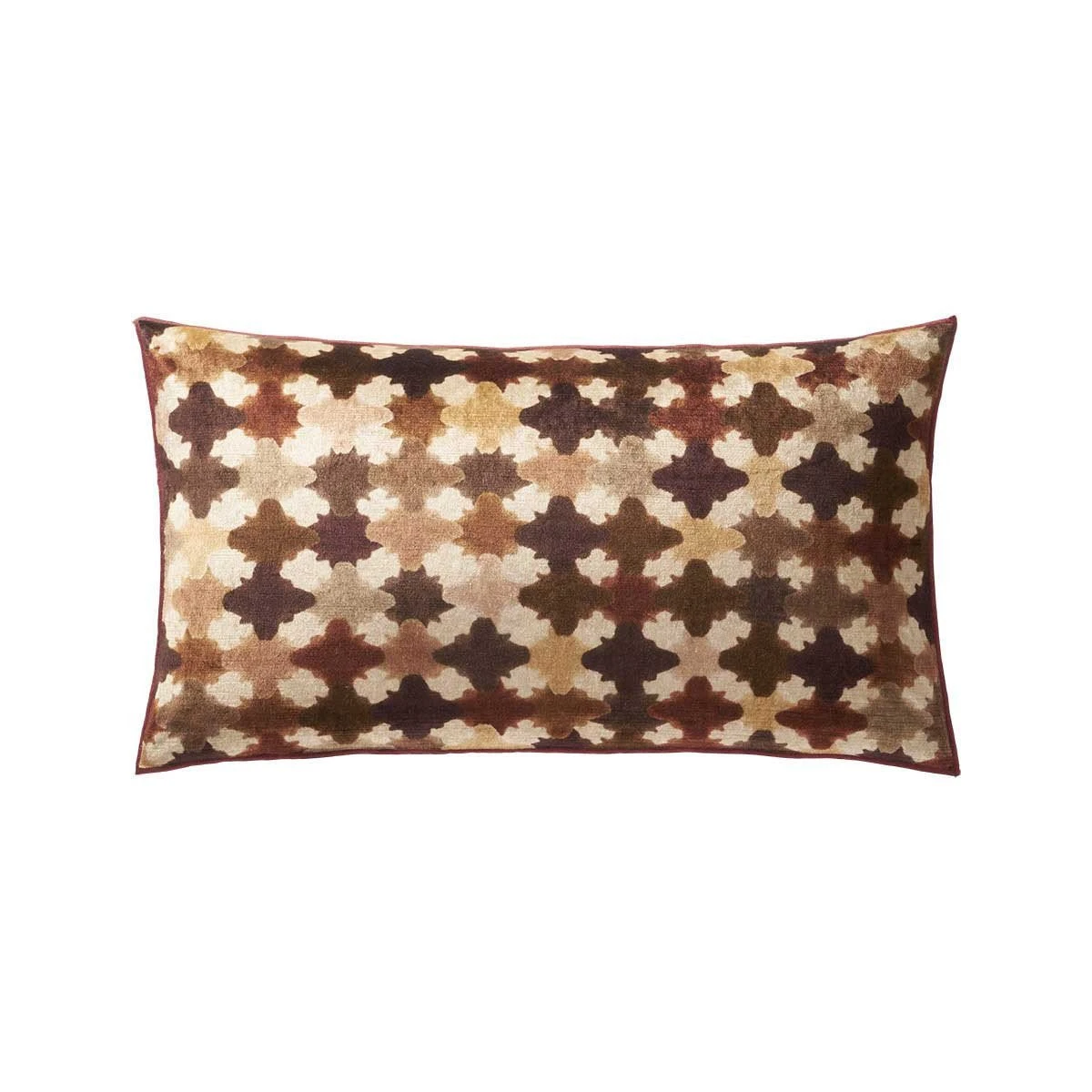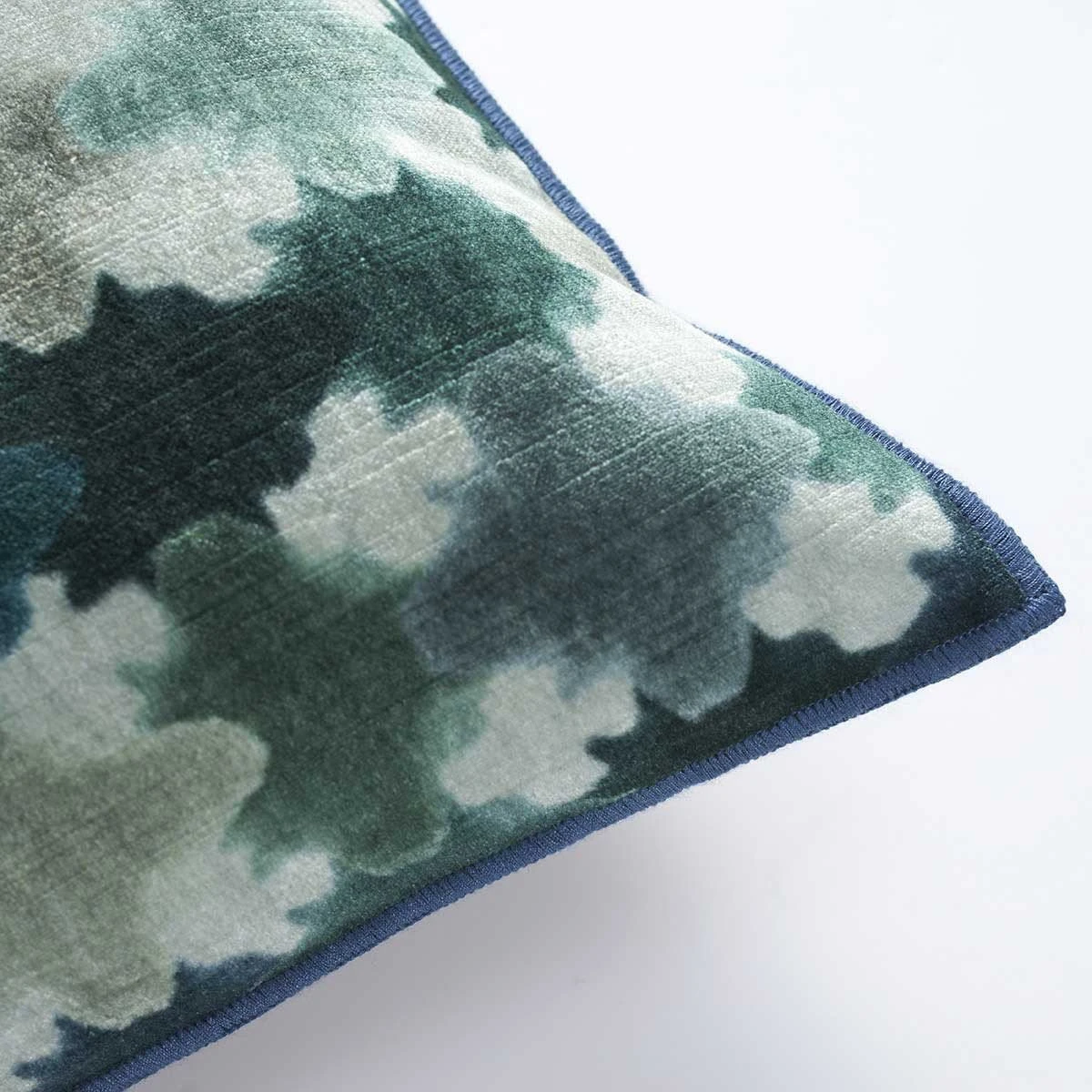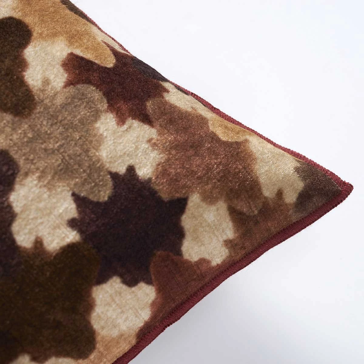 The impression on velvet is embellished to create personalized harmonies. Printed velvet with piped finishing around the perimeter and zipper closure along the bottom side.