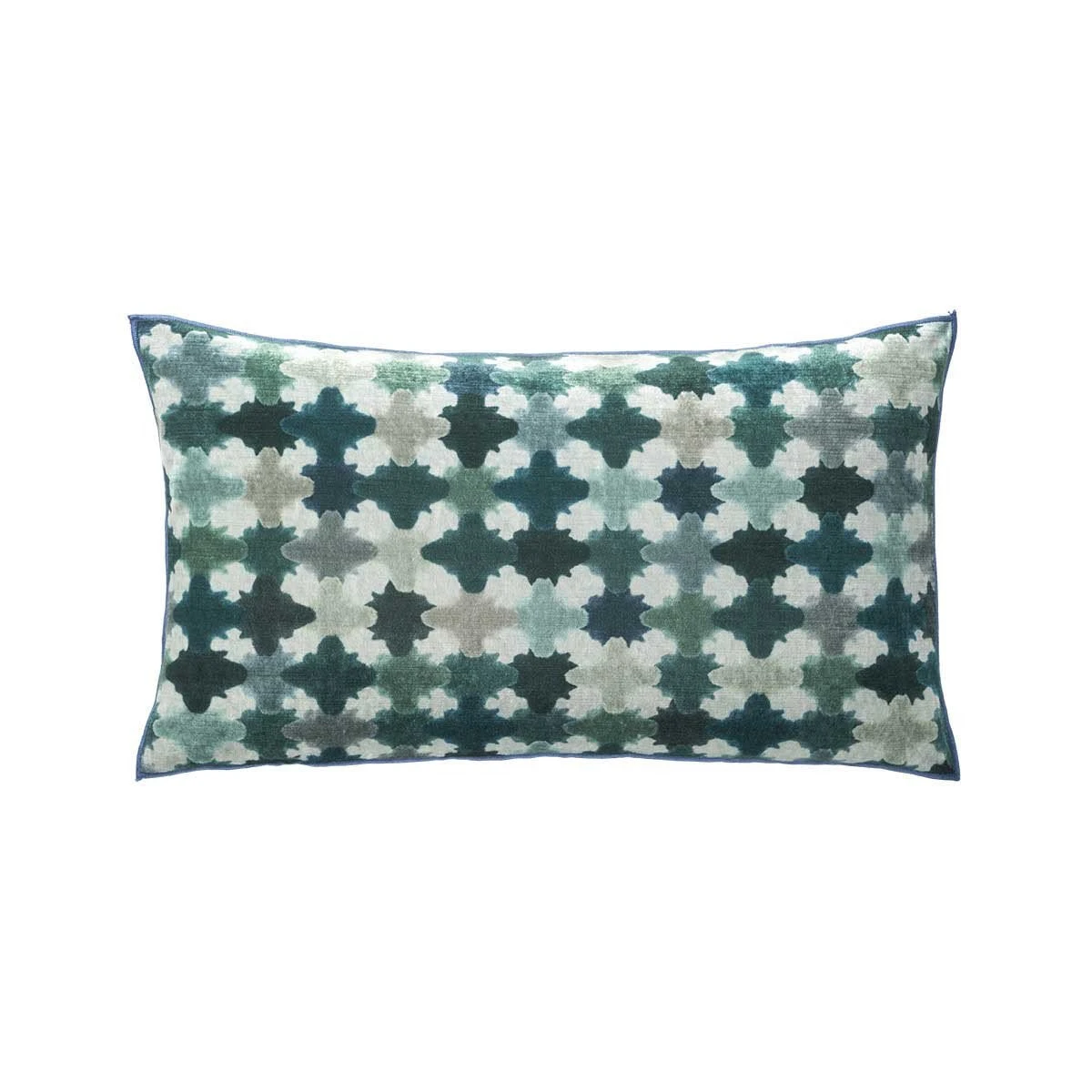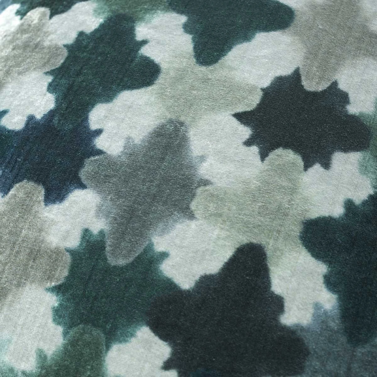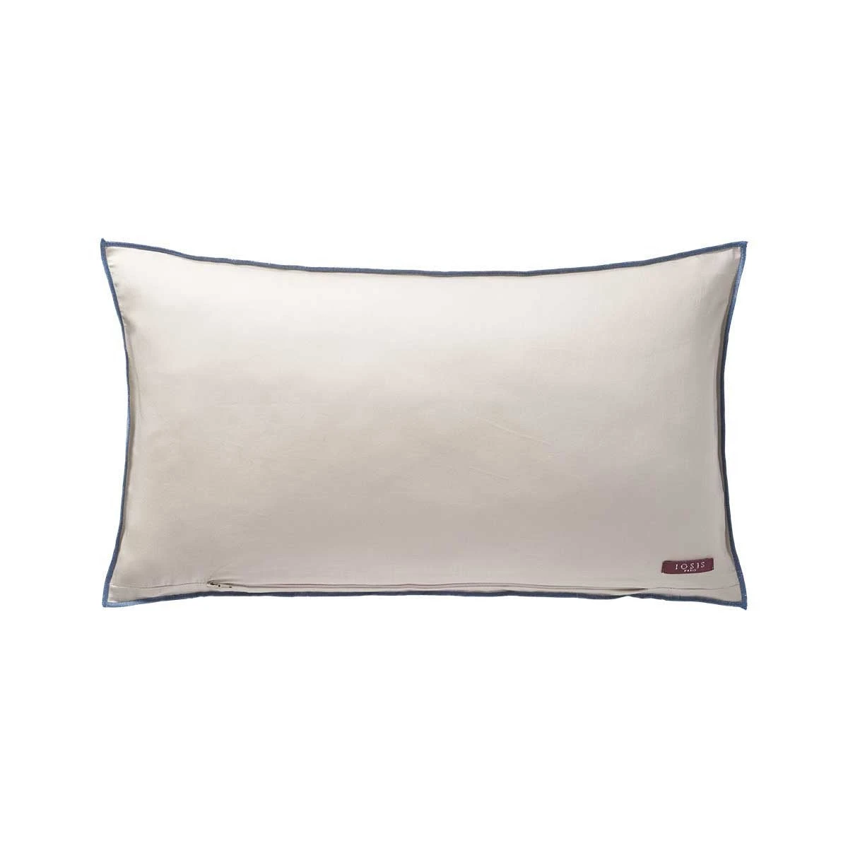The impression on velvet is embellished to create personalized harmonies. Printed velvet with piped finishing around the perimeter and zipper closure along the bottom side.