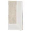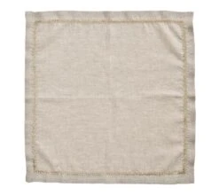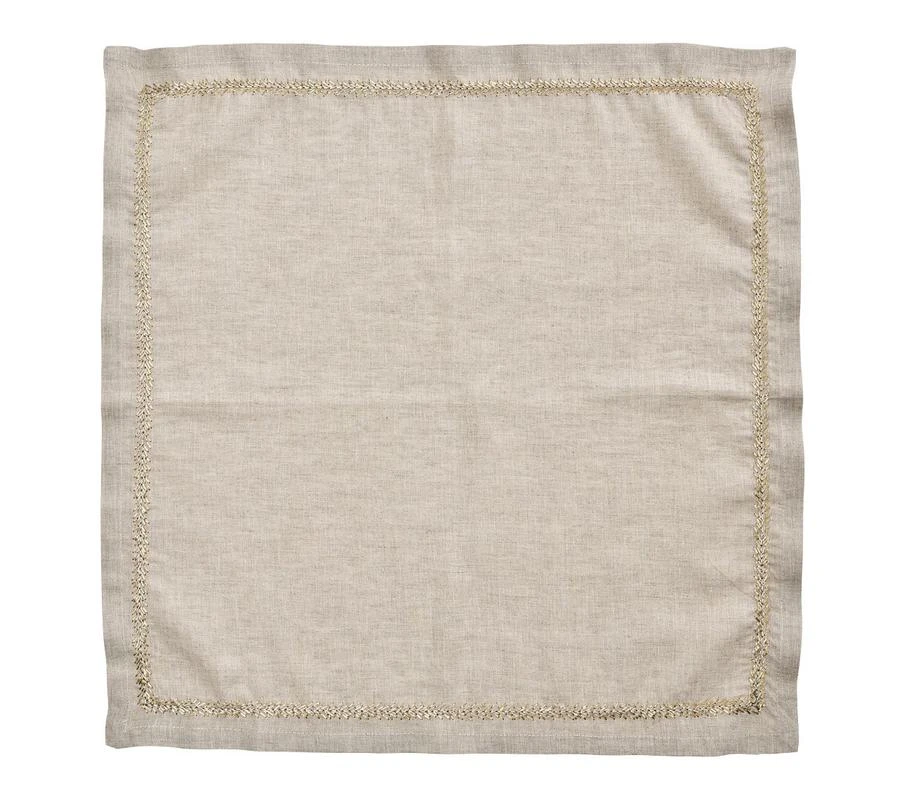 The linen Jardin Napkin in natural, gold, and silver features intricate embroidery in gold and silver along with the trim of the natural linen napkin.