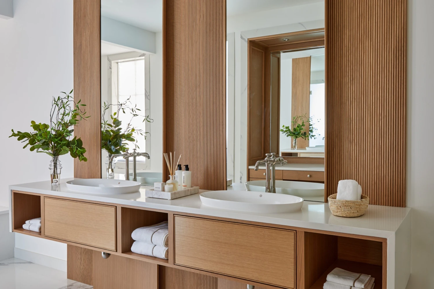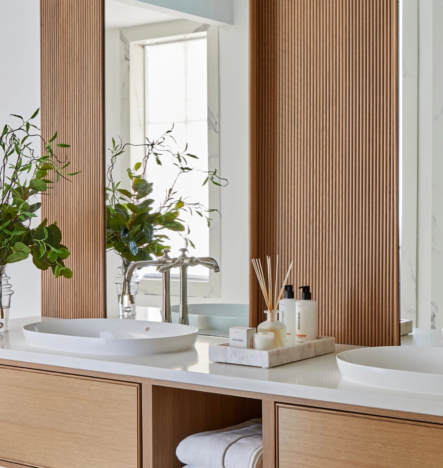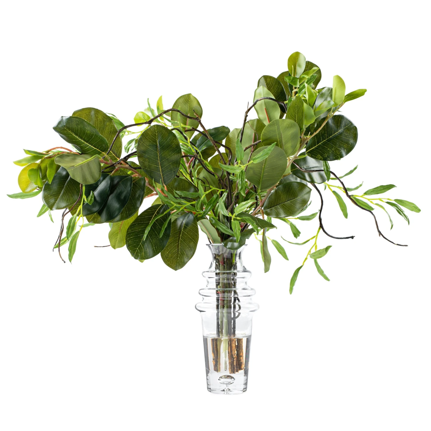 This bouquet of natural green adds a fresh and stylish touch to any room. The faux branches are presented in a contemporary glass vase with illusion water and is the perfect decorative accent for a front hall table or dining room console.