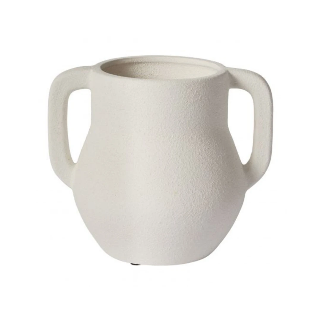 The Marve Vase features a full bottom with two handles that lead up to a wide opening. Surface is bright white with a sandy texture.