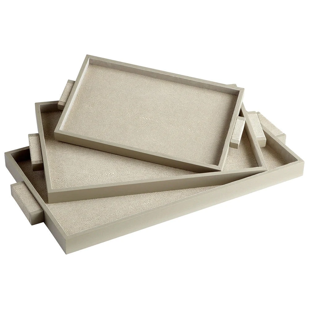 Varying textures from this serving tray creates dimension in any living room. The contrast between the leather and wood add a modern touch to a simple silhouette.