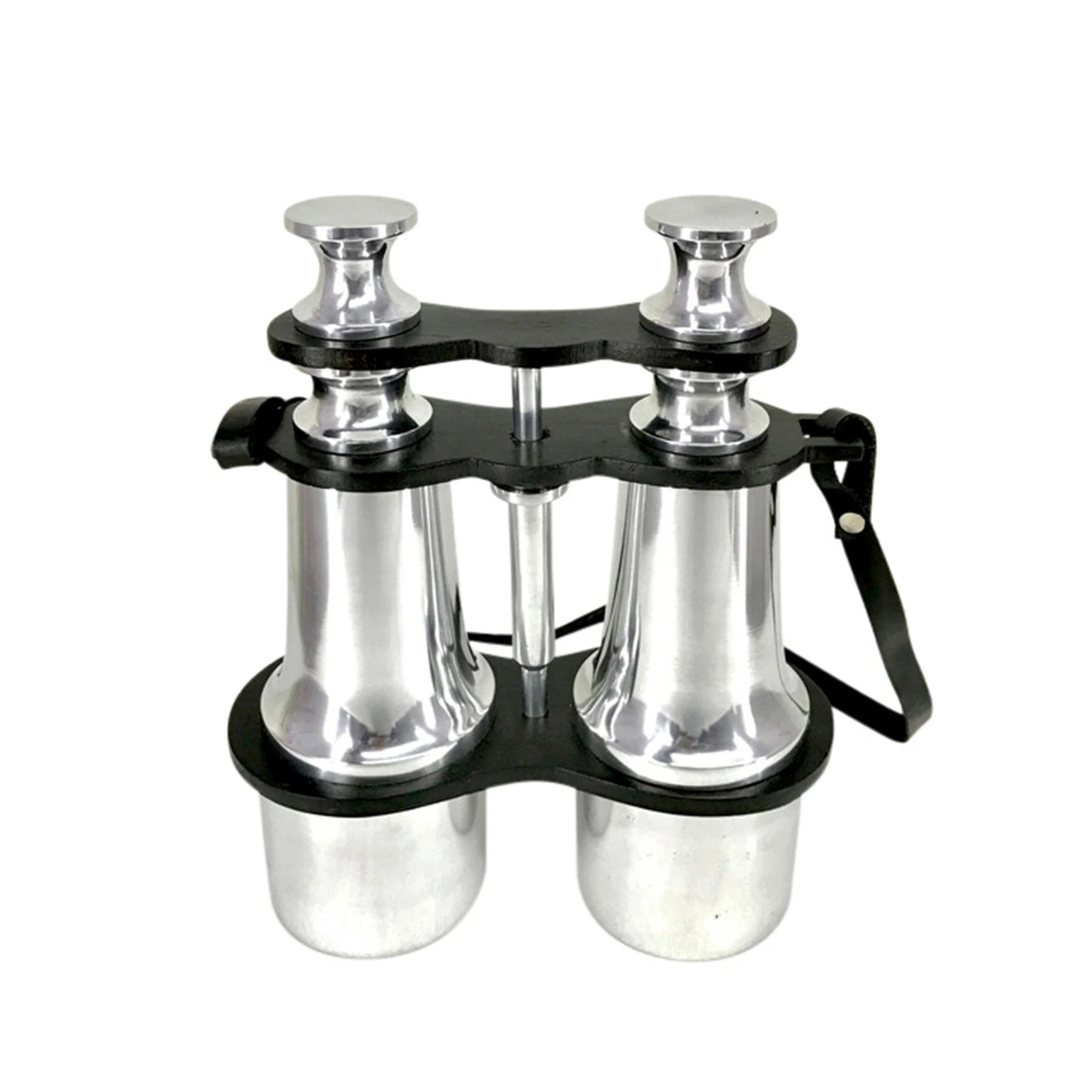 Add rustic style to your space with these luxe silver tone metal binoculars.