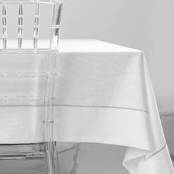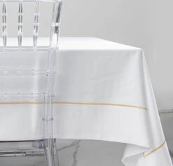 Understated elegance this white spill proof, washable ez care tablecloth with silver or gold embroidered trim, it is perfect to elevate your dinning table.