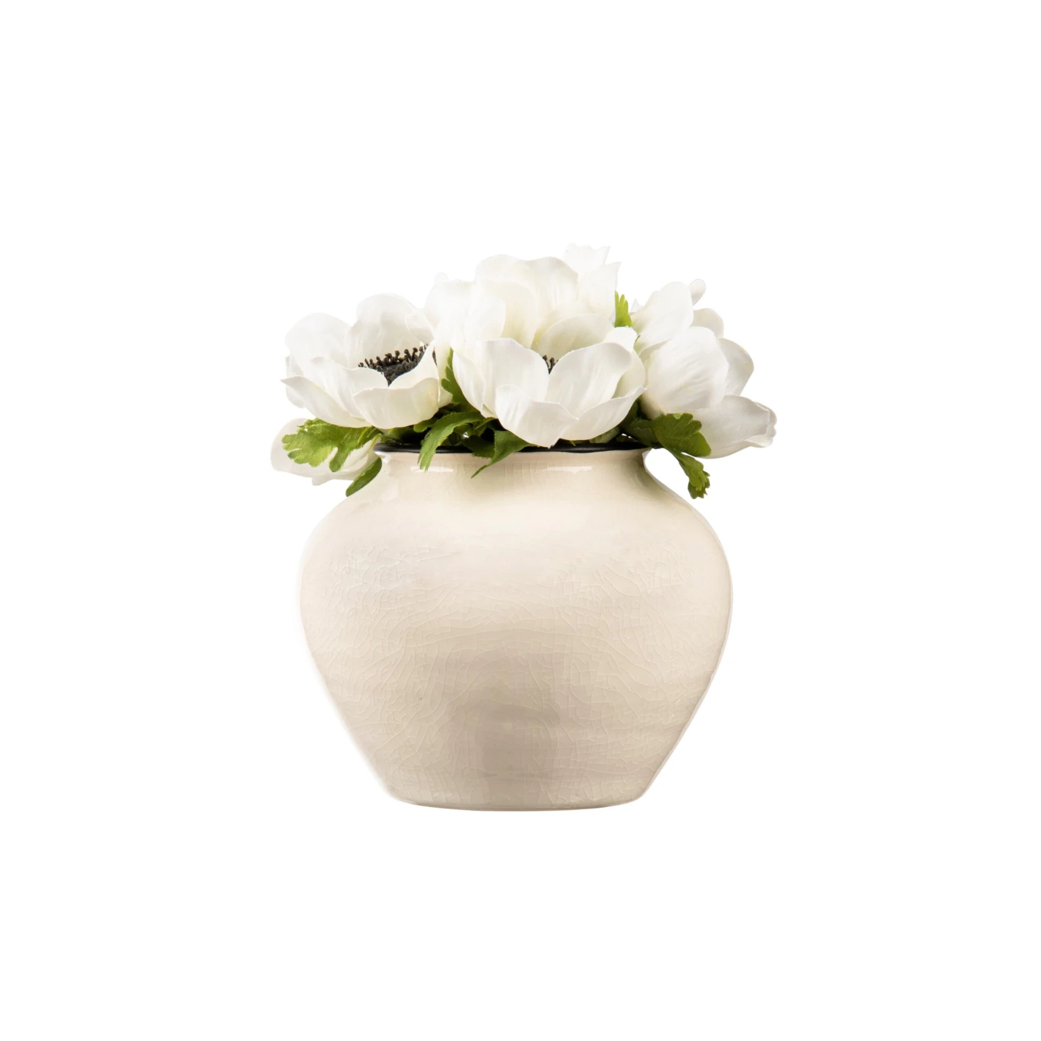 Filled with anemones, this white vase with a black rim is perfect for accenting consoles, mantels, bedsides tables, or any small space.
