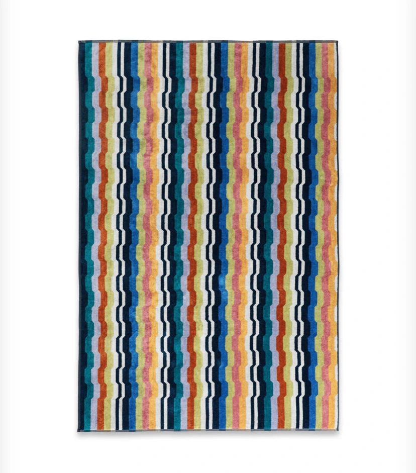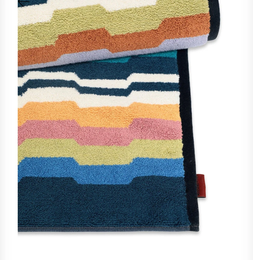 Missoni Home’s Wilbur bath towel in a multi-colored, enlarged Greek-key-like chevron pattern.