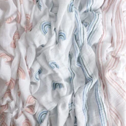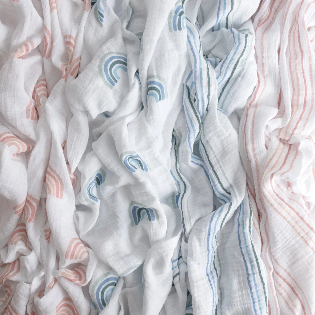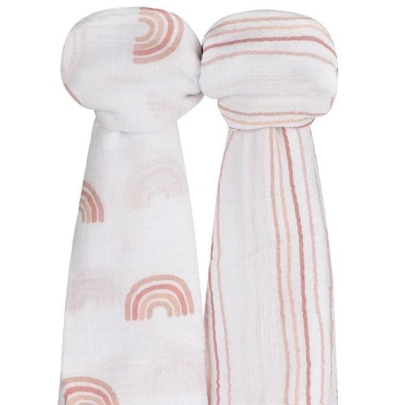 This duo features two modern swaddles. A trendy stripe design and a rainbow in beautiful hues of pink.