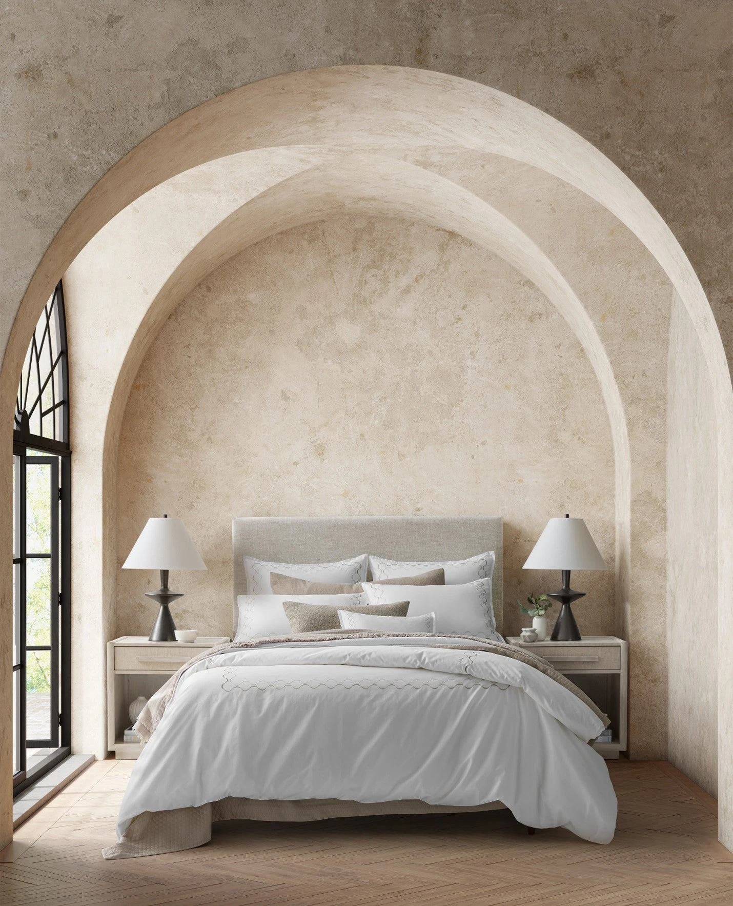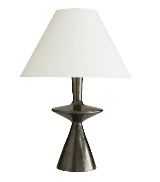 This lamp is anything but ordinary. From every direction, the silhouette reveals three stacked rounded forms—cylinder, disk and cone—to showcase angular composition and balance. It has a mid-century feel, but its deep antiqued aluminum finish offers a new take on the style. Topped with a tapered linen shade in ivory with a white cotton lining.