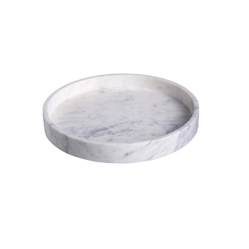 This 9” round marble tray can be used as a decorative accent or as a serving tray.