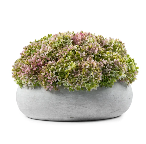 Pink and green mini Hydrangeas artfully clustered in a cement pot, adding color and style to your space.