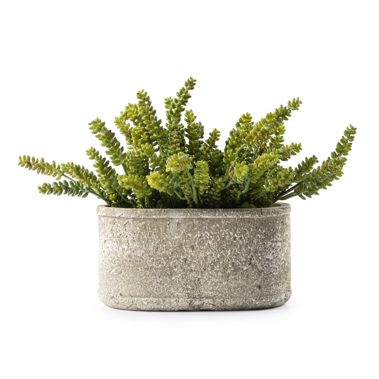 This stone succulent planter has a vintage, aged look and it holds a mix of realistic artificial succulents. Place the pot on an empty window sill, a coffee table or a shelf.