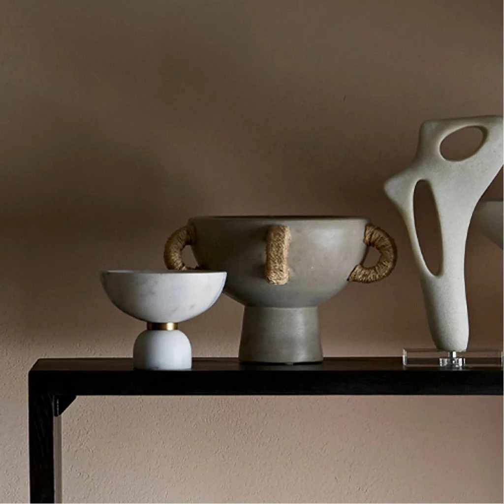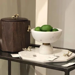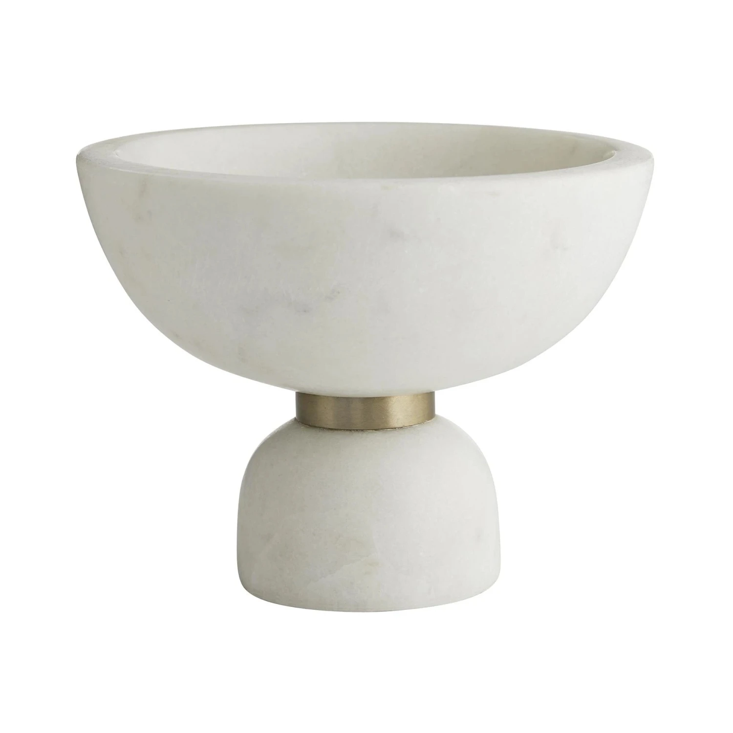 Mixed materials in simple geometrics with this concave-shaped container. Smooth white marble creates a bowl-shaped form that is showcased on a white marble platform and accented by a thin antique brass belt. Elevates a space instantly, whether in use as a snack bowl or a catchall container. Food safe.