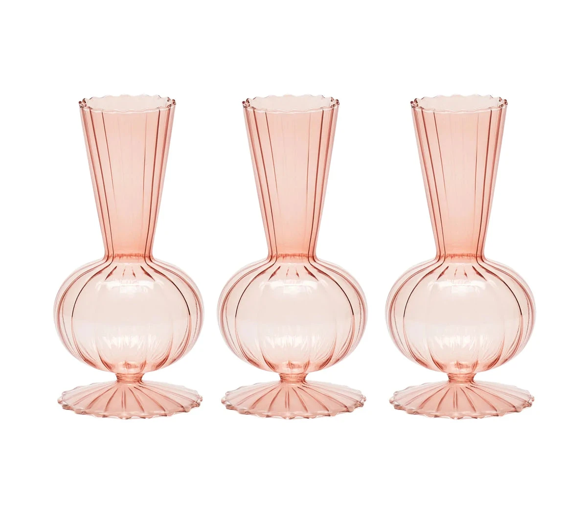 The delicate, hand-blown glass Tess Bud Vase features a tapered flute atop a globe and finished with a scalloped base. This stunning glass bud vase adds sophistication to any table.
