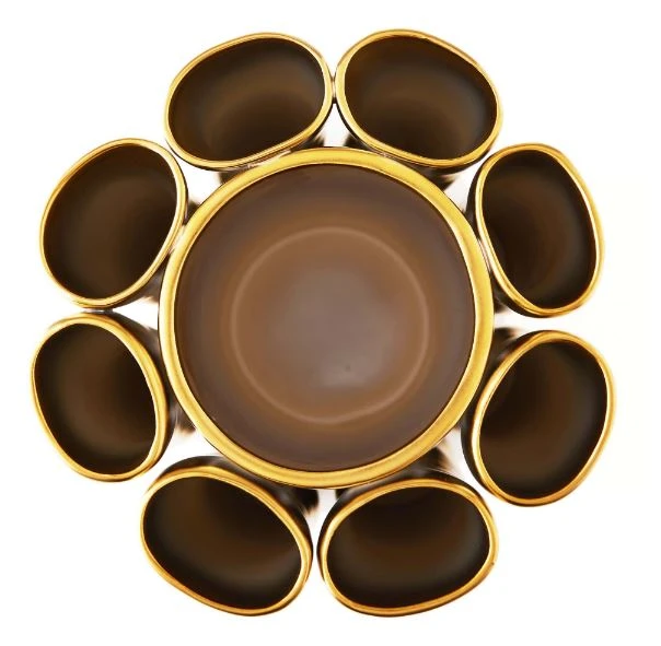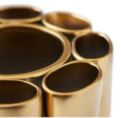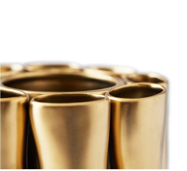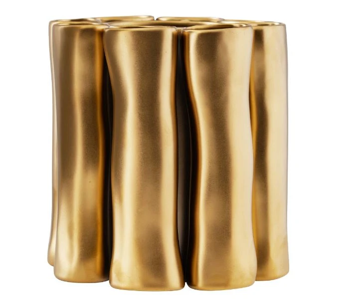 The Vescovi vase was designed to ignite creativity, the piece is formed with irregularly shaped tubes of matte gold ceramic that surround the larger interior opening. The watertight bud vase is both pretty and playful, and presents myriad display options for flowers and greenery.