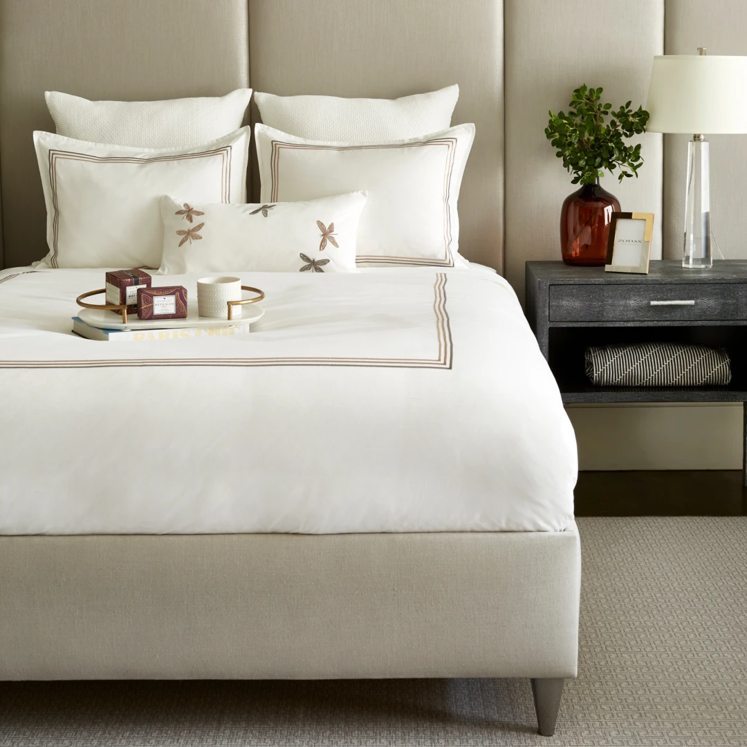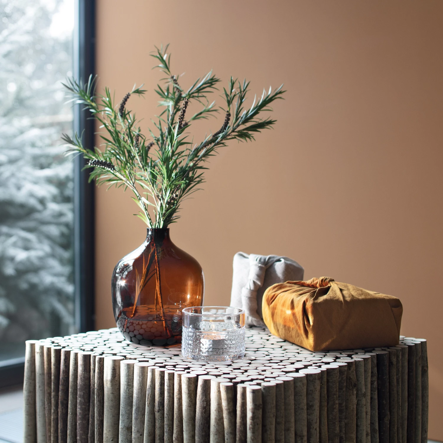 A small organically-shaped vase, mouth blown by master glassblowers from cased-coloured glass. The curved narrow neck is designed to draw a few stems of flowers or foliage together.